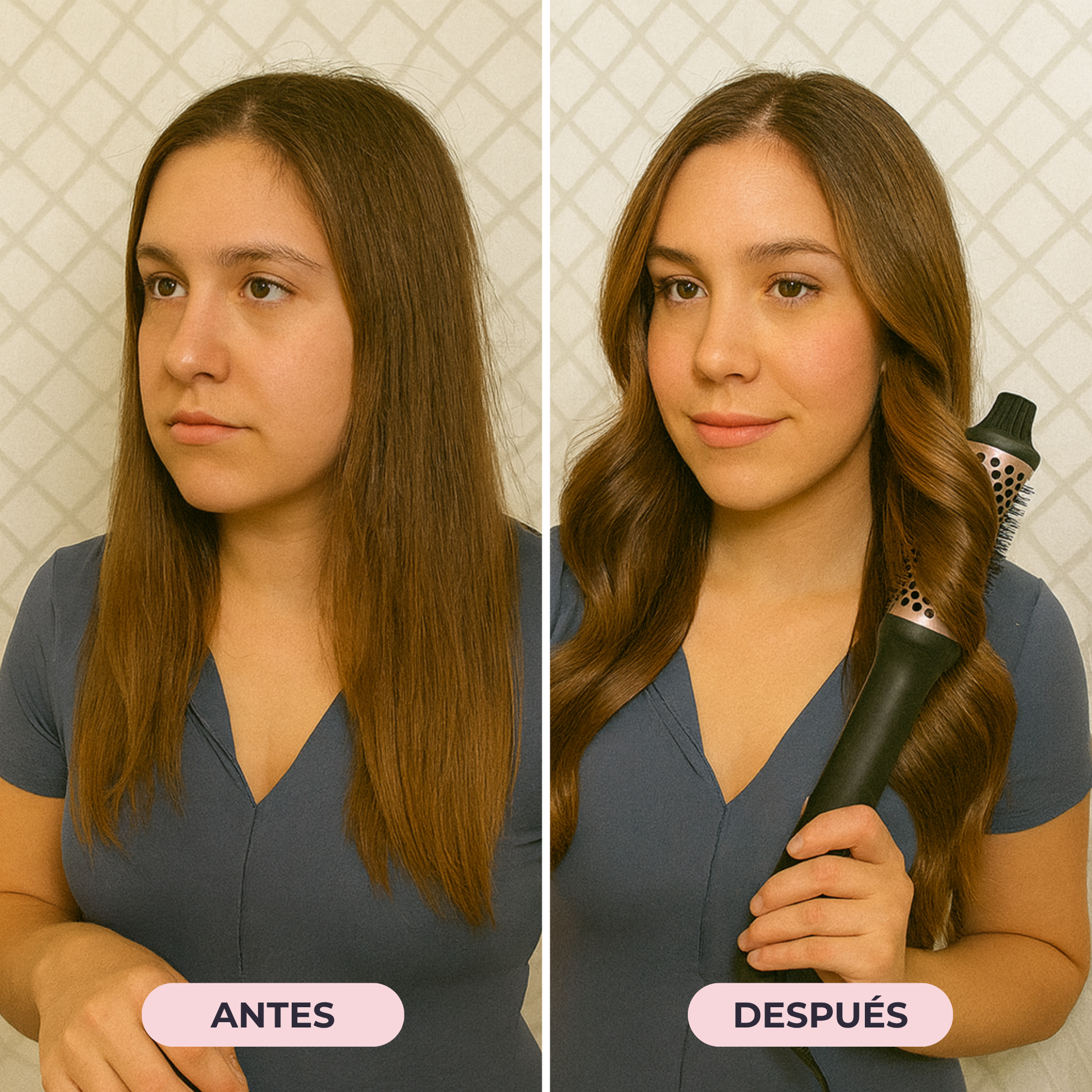 Para un lookliso y pulido, pasa el cepillo directamente hacia abajo. Si prefieres ondas o rizos con movimiento,enrolla las puntas y suelta con suavidadpara un acabado impecable digno de salón. ✨